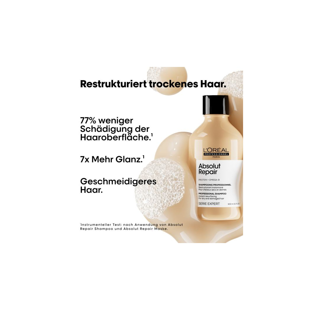 Das Absolut Repair Shampoo sorgt für sanfte Reinigung von sehr trockenen spröden bis strapazierten Haaren. Die im Shampoo enthaltenen Proteine aus Weizen, Soja und Mais dringen während der Haarwäsche in offene, beanspruchte Haarfasern ein, lagern sich an und reparieren so Defekte im Haar-Inneren. Der Wirkstoff Omega-9 hingegen repariert äußere Defekte der Haaroberfläche, glättet die Schuppenschicht. Der im Shampoo enthaltene Quinoa-Extrakt verleiht trockenem Haar mehr Feuchtigkeit. Der L'Oreal Klassiker Absolut Repair Shampoo stärkt das Haar von Innen wie von Außen, sorgt für eine höhere Widerstandskraft, so dass trockenes geschädigtes Haar zunehmend an Spannkraft, Glanz und Kämmbarkeit gewinnt und vor (weiterem) Haarbruch und Spliss bewahrt bleibt. Das Absolut Repair ist für die tägliche Haarwäsche geeignet.
